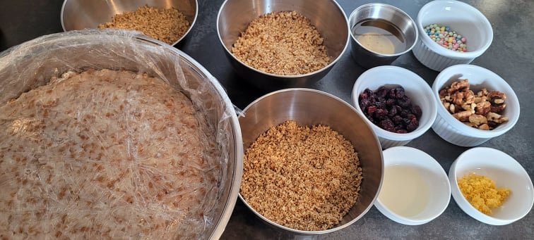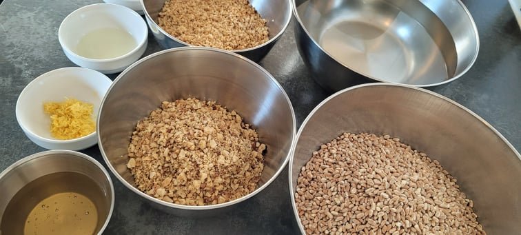 8. Opriți focul , acoperiți cu capac și lăsați să se răcească bine. Eu am lăsat 3 ore dar puteți lăsa și peste noapte. În acest timp vor înflori si boabele care nu au făcut-o în timpul fierberii și vor absorbi tot lichidul rămas. 9.Când grâul este răcit bine, adăugați mierea ,zestul de la lămâie ,nuca măcinată ,nuca tocată cu cuțitul și esența de vanilie. 10. Amestecați totul bine și gustați, dacă nu e suficient de dulce mai adăugați miere după gust. 11. Coliva este gata .Trebuie să fie consistentă și să-și păstreze bine forma.